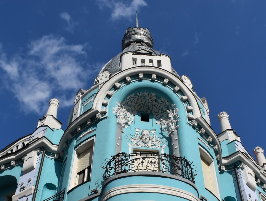 A két utcára néző homlokzat között kiemelkedik a leggömbölyített sarokrész, fölötte a nagy kupolával, valamint a második emeleti erkély díszítése, a női fejét ábrázoló dombormű, melyből ág-, levél- és virágmotívumok nőnek ki. Az erkély kétoldalára fa alakú stukkódísz került, teteje mintegy lombozatként takarja be a bemélyedés boltozatát. Érdemes megfigyelni az alaposan kidolgozott kovácsoltvas erkélykorlátokat is, amelyeket szintén virágmotívumok díszítenek.