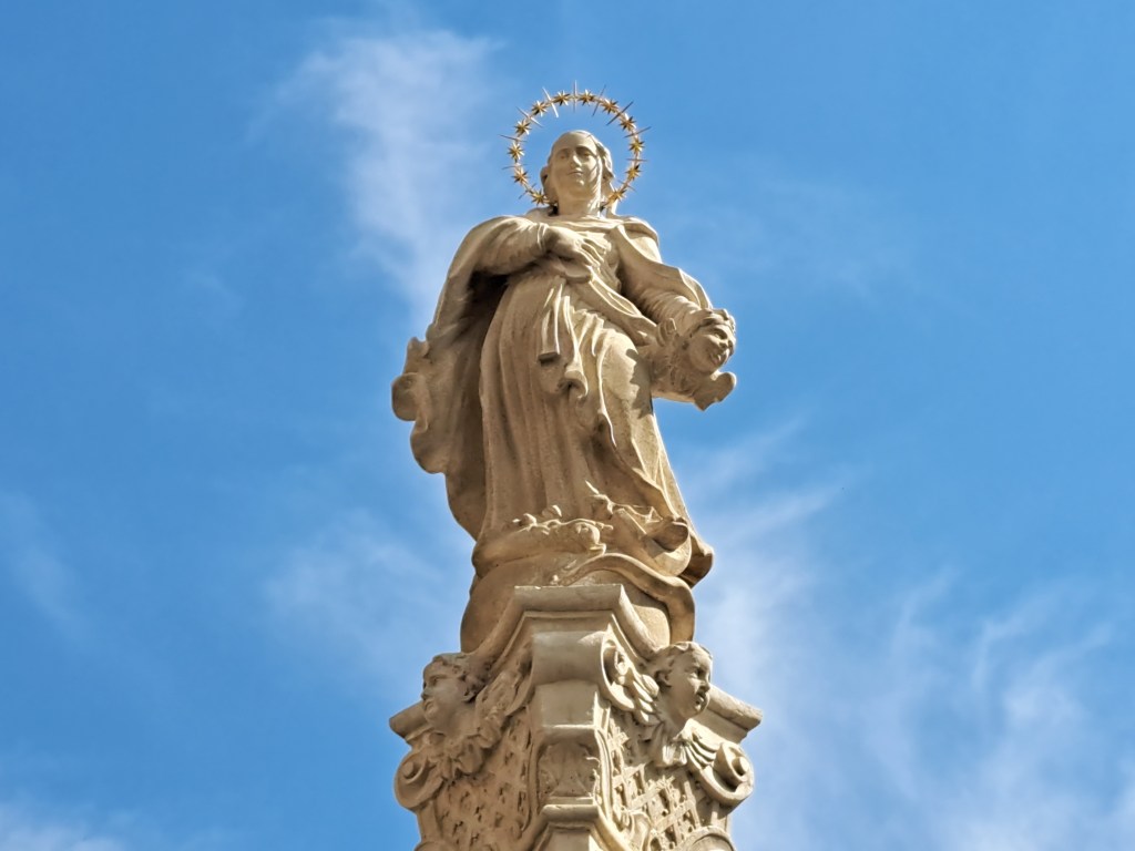 Lépcsőzetes, magas talapzaton helyezkedik el az angyalfejekkel és felhőkkel átszőtt oszloptörzs, azon egy lendületes Mária szobor áll. Testét fodros lepel fedi, arca fiatalos, fejét csillagkoszorú ékesíti.
